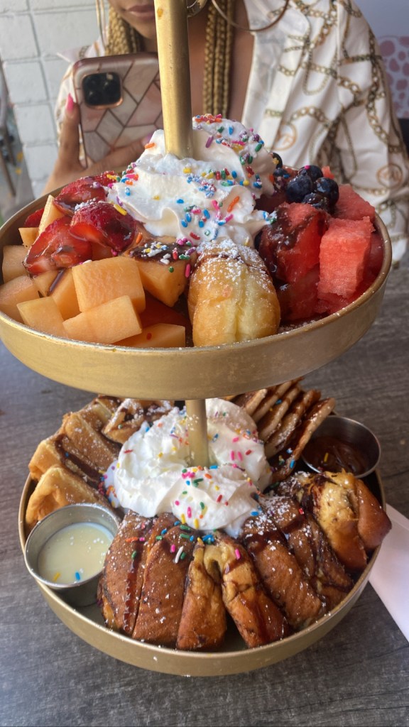 Our actual tower did not have these things, but it did have the items pictured on the Instagram page and the items our waitress listed: pancakes, waffles, French toast, a couple doughnuts, and fruit with whipped cream and sweet dips.