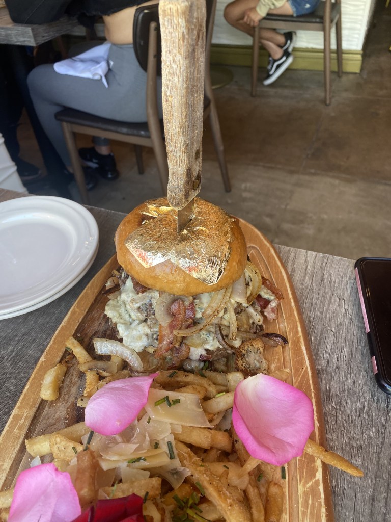 This beautiful burger includes two Angus beef patties with bacon, caramelized onions, and bleu cheese crumbles with a side of mustard aioli and truffle fries. As you can see, it’s unique due to the thin sheet of gold included on the top bun.