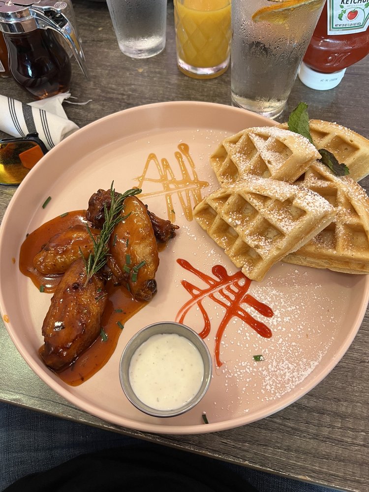 The brunch buddy who ordered this was not impressed, so I didn’t try to get a picture of her plate. However, it consisted of 3 chicken wings, waffles, and a dipping sauce.