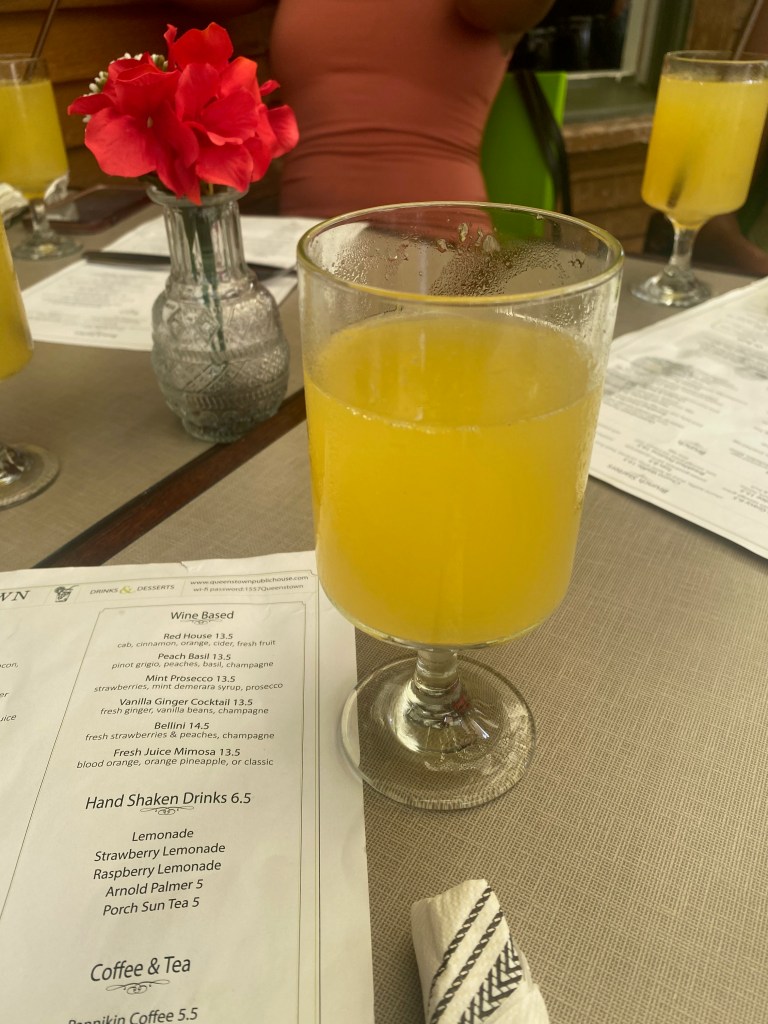 Queenstown’s house mimosa comes with three juice options: blood orange, orange pineapple, or classic OJ. I was in the mood for something simple and traditional, so I went with the classic. The regular price is $13.50, however if you catch the brunch special they are half off. Still a little pricey for a mimosa, but it tasted good and they give you a generous amount of drink (not to mention, a generous OJ to champagne ratio).