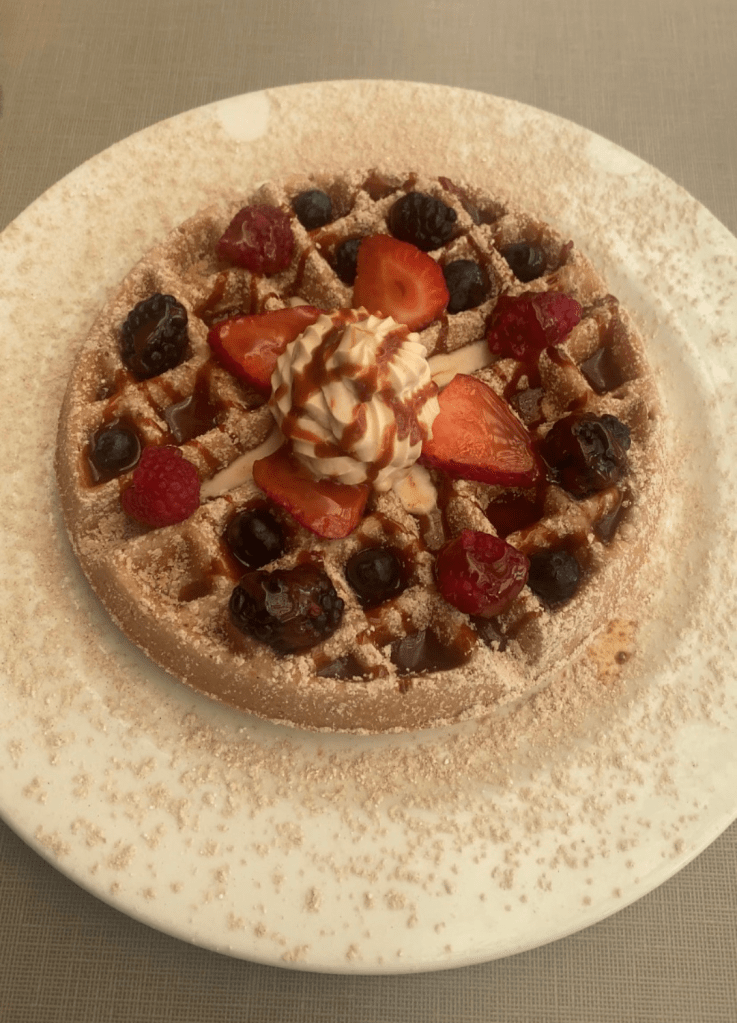 It’s described as a churro waffle drizzled in caramel and topped with fresh fruit and dulce de leche whipped cream. They had me at caramel.